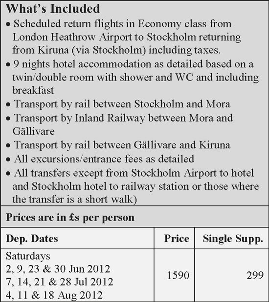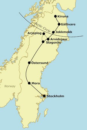 This particular tour begins in Sweden's lovely capital city, Stockholm, and makes a leisurely journey northwards including Lake Siljan and Östersund before arriving at its final destination, Kiruna.